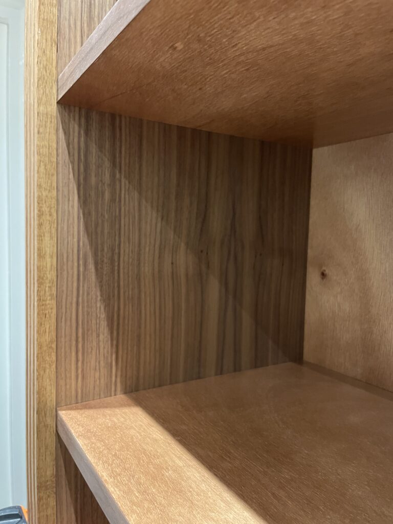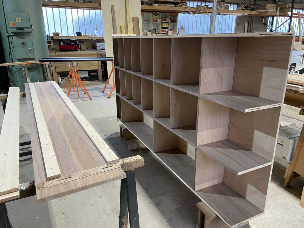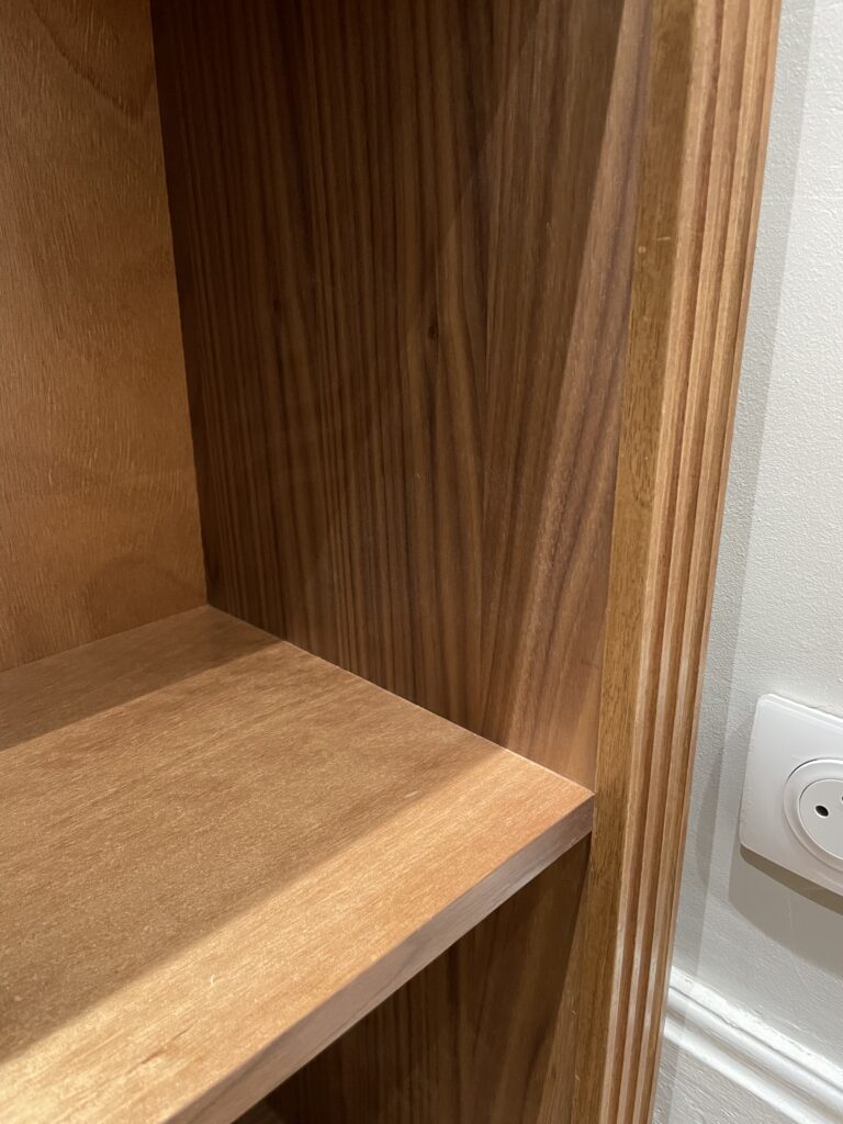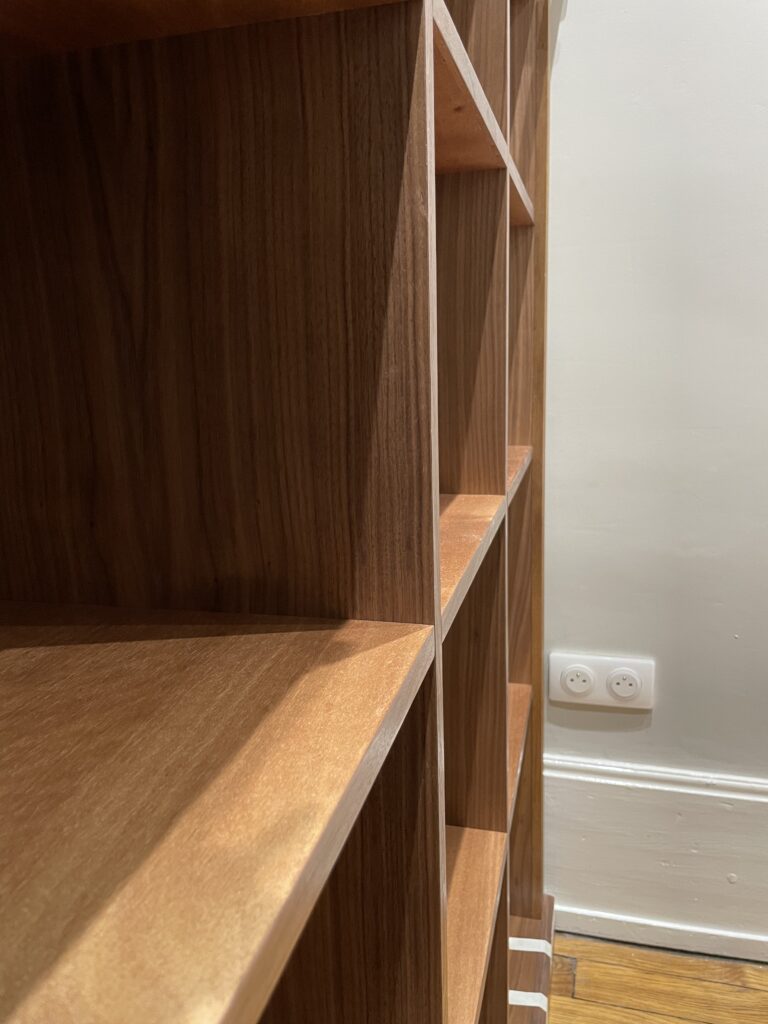 L’ensemble a reçu une finition vernis satiné, mettant en valeur le veinage du bois. La bibliothèque est fixée sur la cloison arrière pour garantir stabilité et durabilité.